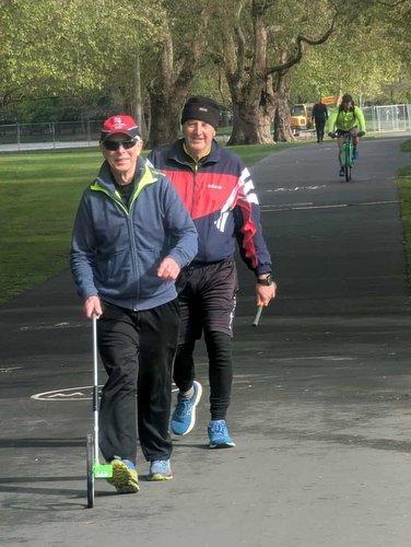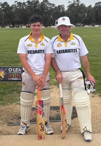 | Tim doing some measuring with NZ Centurions secretary Philip Sharp in Christchurch, NZ, at the NZ 6 Day Championship | Nephew Andrew and his son Archie opened the innings for Katamatite B Grade - that must be a first! | |